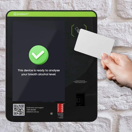 Wall mounted breathalyser with RFID card reader for user verification during breath alcohol tests. Sync test data to the cloud via Andalink.